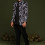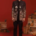 This elegant Jodhpuri set features intricate Cut Dana handwork, paired with a beautifully embroidered short shirt. The collar is adorned with exquisite handwork detailing, adding a luxurious touch. The trouser has two pockets for convenience, while the shirt is lined with pure viscose for added comfort.