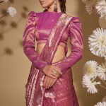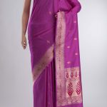 Uma is a wine-colored Bridal Banarasi Katan Handloom Saree woven in Gold Zari, inspired by floral arrangements symbolizing a Nayikaa’s longing. Featuring delicate floral butas, an intricate temple border, and konia corner work, it combines tradition with modern charm. The pallu is enriched with a lotus-based floral motif.